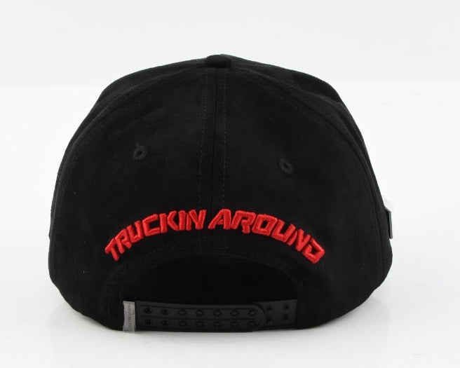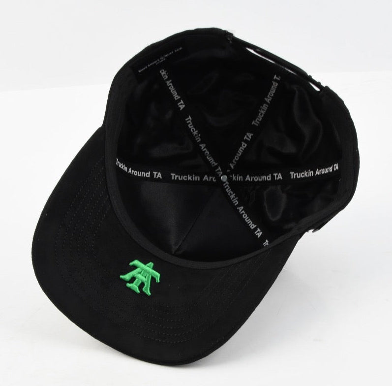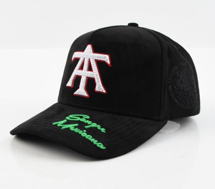 All suede SnapBack , with a white TA logo in the front cover in rhinestones. Mexico theme , that includes a Mexico flag pin on one side and “Sangre Mexicana” embroidered to the upper side of the brim.